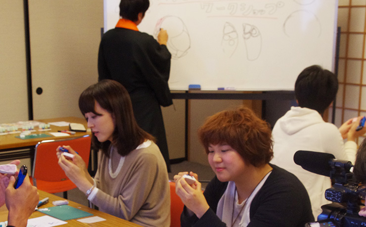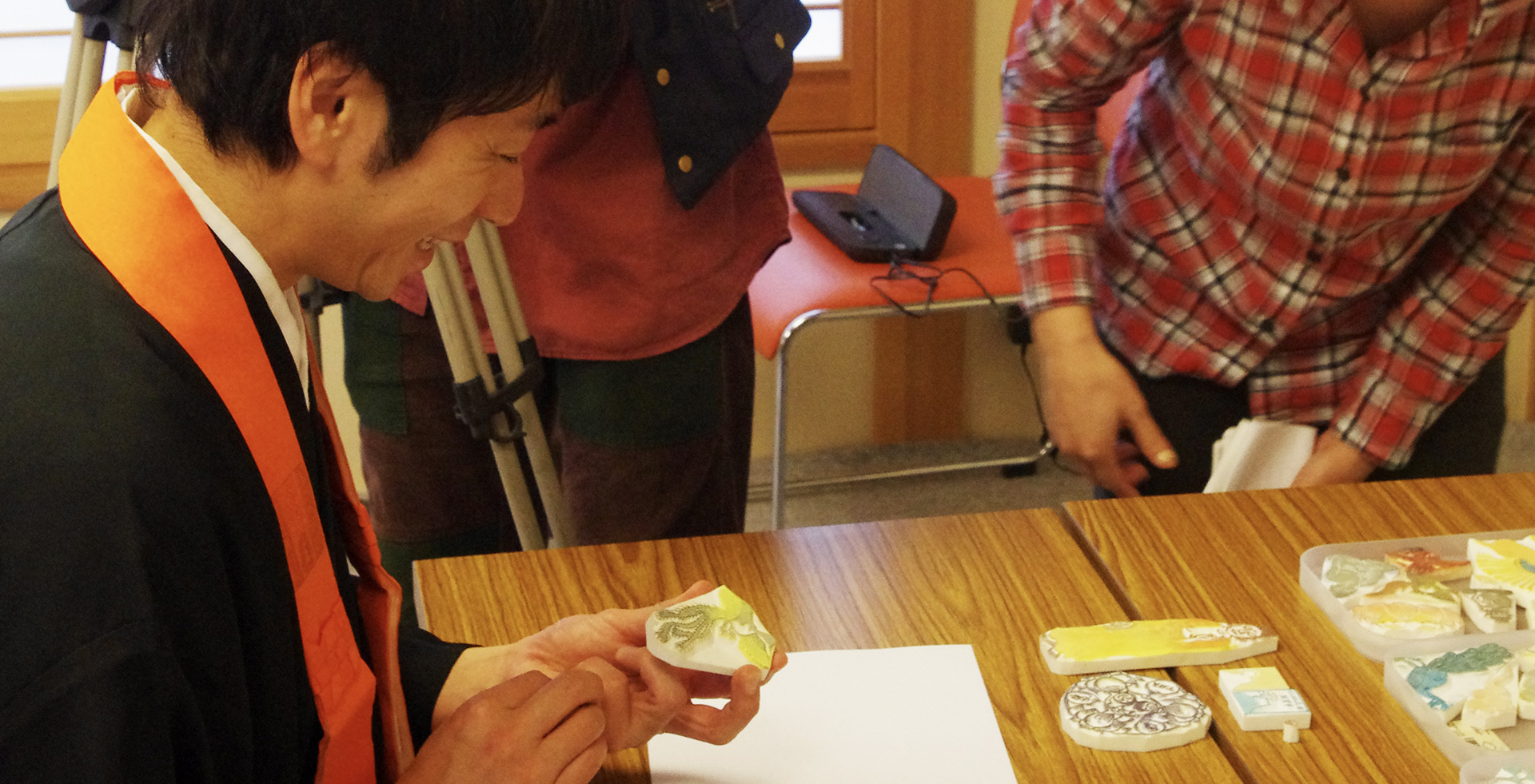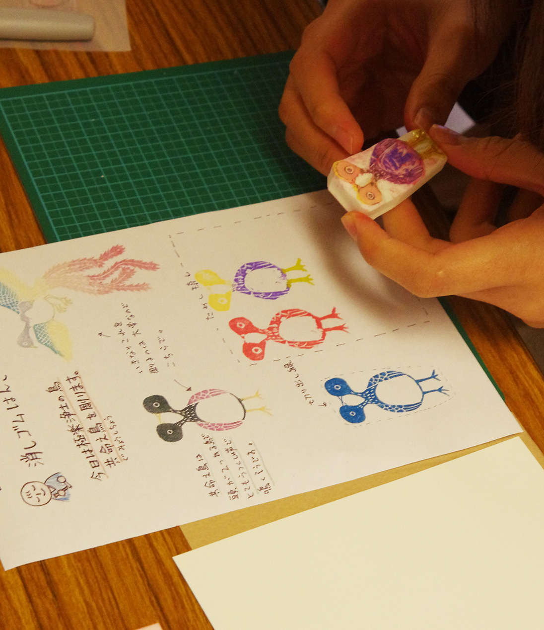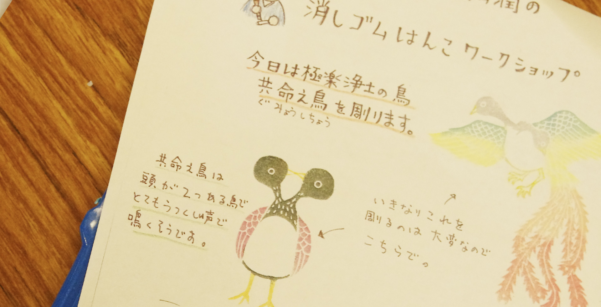 仏教説話に登場する2つの頭を持つ鳥[共命鳥]を消しゴムはんこで作成しました。 カッターと消しゴムを握り、うまく出来ないことに笑い、ほんわかした空間でワークショップは進み、各自が選んだ十色の朱印で押された共命鳥が並びました。